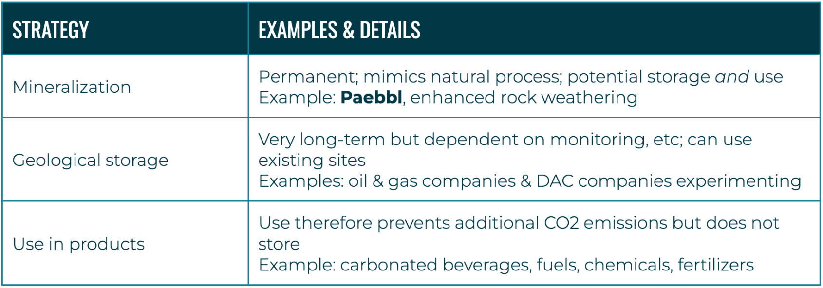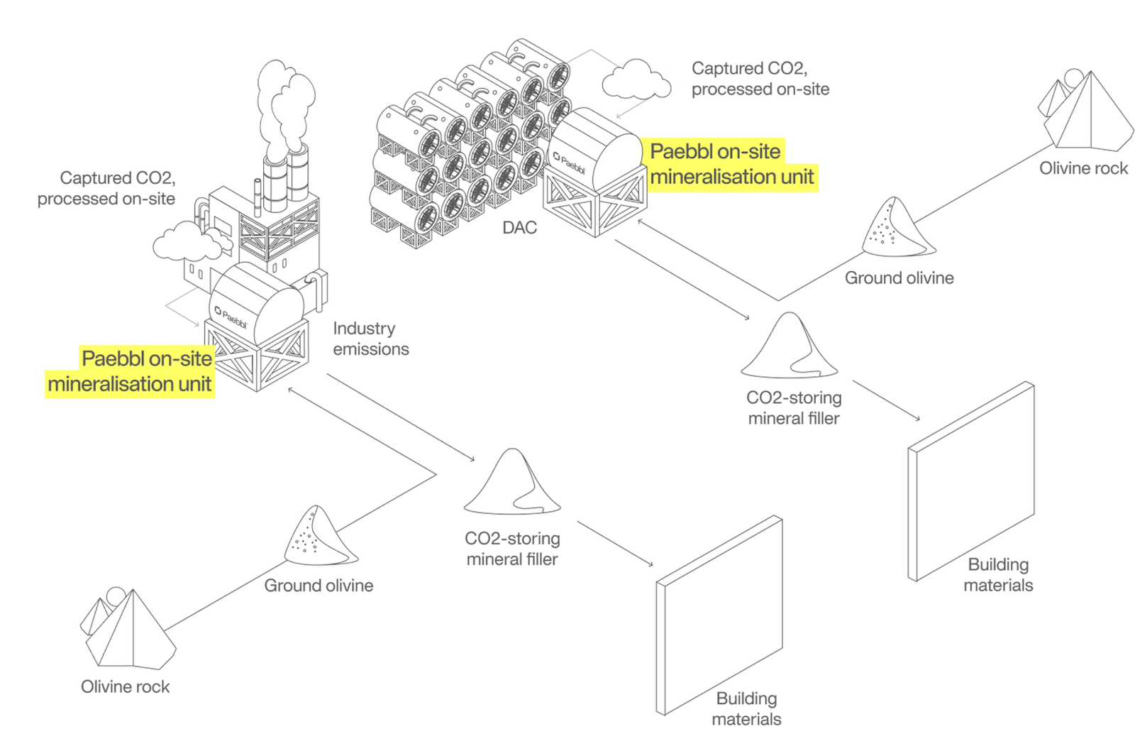 Carbon capture, utilization, and storage (or, CCUS), is a set of technologies that capture CO2 from different gas mixtures, such as from industrial plants or the atmosphere, and either use or store it. Strategies to capture carbon (CC) include direct air capture (DAC), which uses technology to actively remove existing CO2 from the atmosphere, and point source emissions capture from industrial sources (e.g. factory chimneys). Usage (U) involves upcycling the captured CO2 by turning it into a valuable product. This usually means the CO2 is reemitted, but prevents net new CO2 from entering the atmosphere. Storage (S) involves permanently sequestering the CO2, usually underground, so that it cannot re-enter the atmosphere. Storage typically precludes usage. The pressure for climate technology companies to outcompete traditional, unsustainable competitors by being better, faster or cheaper in their respective marketplaces is critical; relying solely on regulation or subsidies is highly risky and considered a non-starter. Most carbon capture companies have struggled in this regard. While CCUS is critical to fight climate change, companies often face the challenge of how to use or store their captured CO2 economically. Paebbl creates a use case for this carbon, thereby solidifying the operational and business case for carbon capture technologies such as DAC.