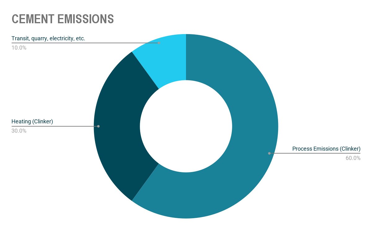 Cement: The “glue” in concrete, cement, accounts for approximately 8% of global emissions. Within this, clinker, a core component of cement that is a mix of limestone and minerals transformed by heat, is responsible for about 90% of emissions. About 60% of cement’s emissions are caused by so-called “process emissions,” referring to the chemical process of making clinker. This process actively creates and releases CO2 via limestone’s chemical reaction. Of the remaining 40%, 30% of emissions is connected to heat for the thermal processes and 10% is linked to everything else. Today, the production of one ton of conventional clinker releases about 0.83 tons of CO2 into the atmosphere.