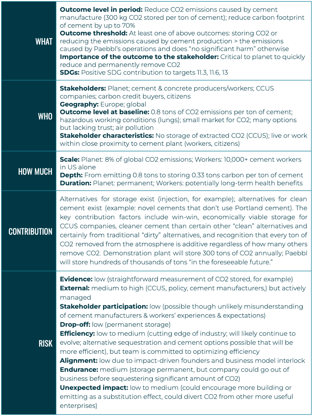 Our final step is to assess impact intentionality. We do so because we believe that intention begets action. While Paebbl is clearly focused on bringing climate-forward solutions to market, we found it difficult to parse out from the company’s public facing materials a specific, concrete mission statement. However, in interviews, Sjögren has stated that Paebbl’s vision is to, “build a portfolio of carbon-storing products that play[s] a key role as a negative emissions technology to decarbonize other industries.” Sjögren makes it clear that cement (and using olivine in the process) is an initial product, and that the team’s vision for Paebbl is to be a foundational de-carbonizer of multiple heavy industries even beyond cement; i.e. that climate impact is a key definitional component of the company’s identity, and an important success factor. Sjögren also states that her personal parameters for founding a company in the climate space were that: (1) it should never allow itself to be perceived as greenwashing, (2) it must be based on a scalable technology; and (3) it must offer a path to profitability if it is going to make a long-term difference in the market. She understands that economic success and climate impact are mutually reinforcing objectives. Likewise, co-CEO Andreas Saari holds a long-time passion for climate, and Paebbl is the second climate tech company he has co-founded.