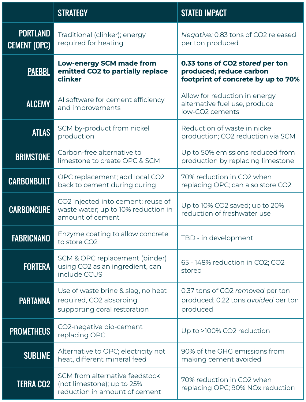 Directly measuring impact can be useful in determining additionality, though, as discussed, it is notoriously difficult to do. Paebbl itself is “proactively align[ing its] methodologies with leading Measurement, Reporting and Verification (MRV) providers and emerging regulatory frameworks, such as the EU's Carbon Storage in Products.” Because one of Paebbl’s primary impact areas is CO2 storage, it is simple to attribute tons of CO2 reduced directly to Paebbl. Every additional ton of CO2 stored can be attributed to Paebbl. (As you can see above, many of the clean cement players measure their impact primarily in terms of CO2 emissions, which is a critical and comparable indicator, but insufficient alone.) The difference in energy and fuel use in cement production using Paebbl is also easy to determine. Assuming Paebbl takes business from dirty cement rather than clean cement players or legacy SCM makers, Paebbl should only have a positive impact on climate. Marketing and continuing to collaborate with others in the space will help build a robust clean cement market that will replace dirty cement rather than cause competition within the small clean portion of the cement industry.
